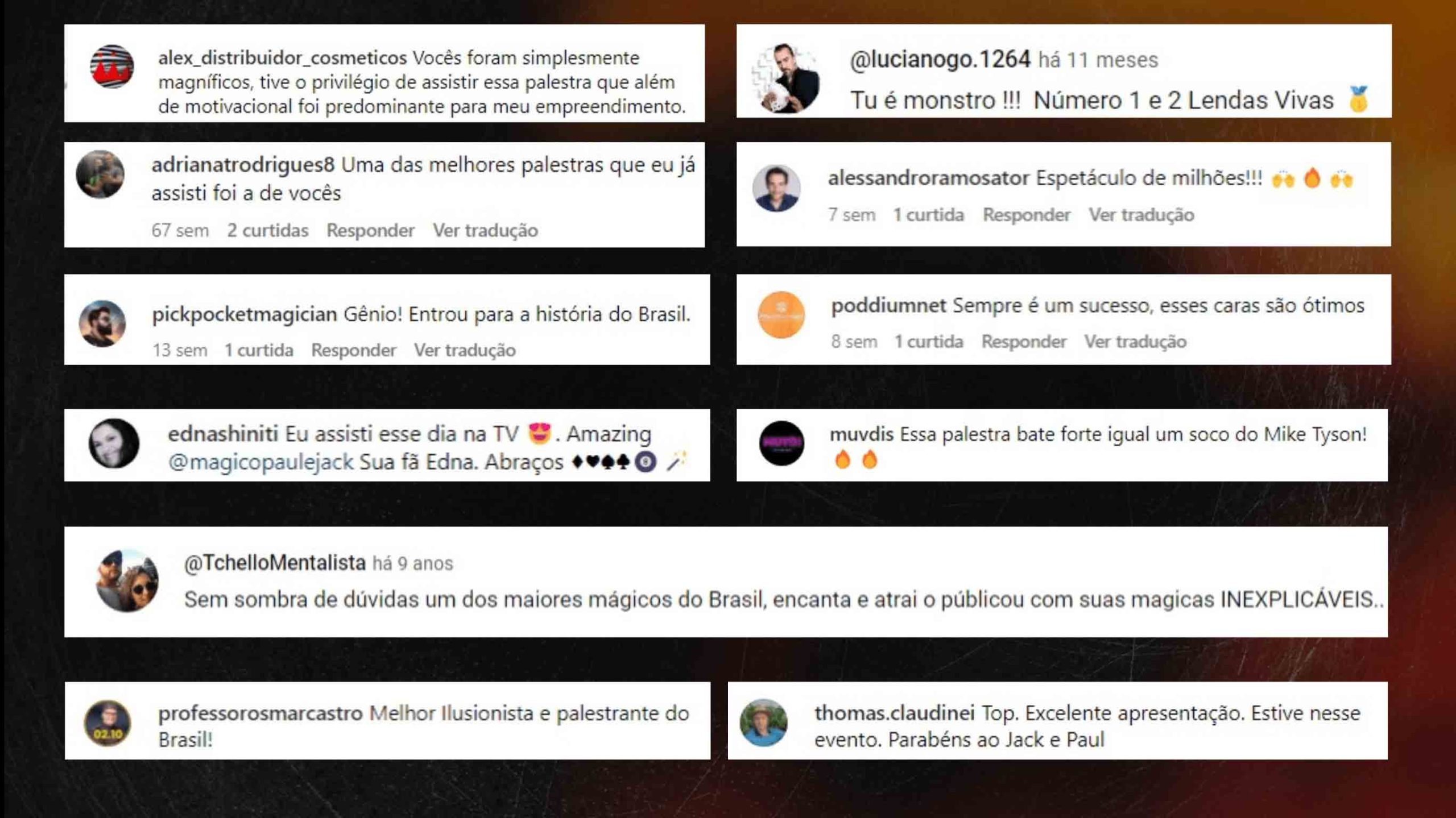 Com Paul&Jack, o público se sente leve, envolvido, entretido. Atenção retida por completo, assistem amando, desejando, aprendendo e já saem aplicando as técnicas ensinadas. ALém de gratos pela empresa que proporcionou essa experiência.